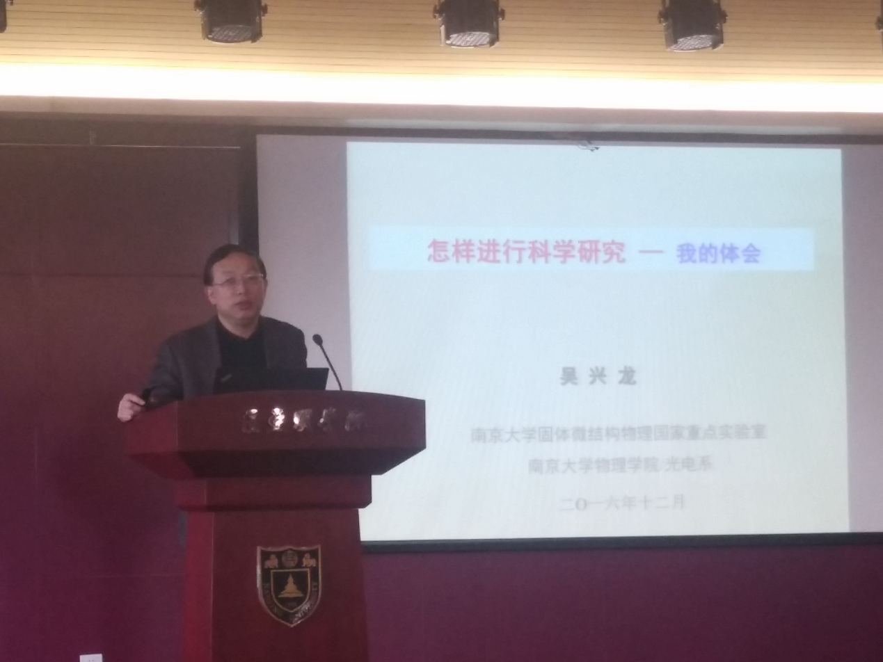 12月7号下午,南京大学物理娱乐城平台 教授、博士生导师,物理娱乐城平台 副院长兼物理娱乐城平台 党委副书记吴兴龙教授在拉斯维加斯娱乐城平台 国生报告厅,为全体15级拔尖计划同学带来了一场以“怎样进行科学研究-我的体会”为主题的讲座。吴教授长期从事半导体纳米材料的拉曼散射和发光特性研究,曾获江苏省科技进步一、二等奖,国家自然科学四等奖,第六届江苏省青年科技奖等。