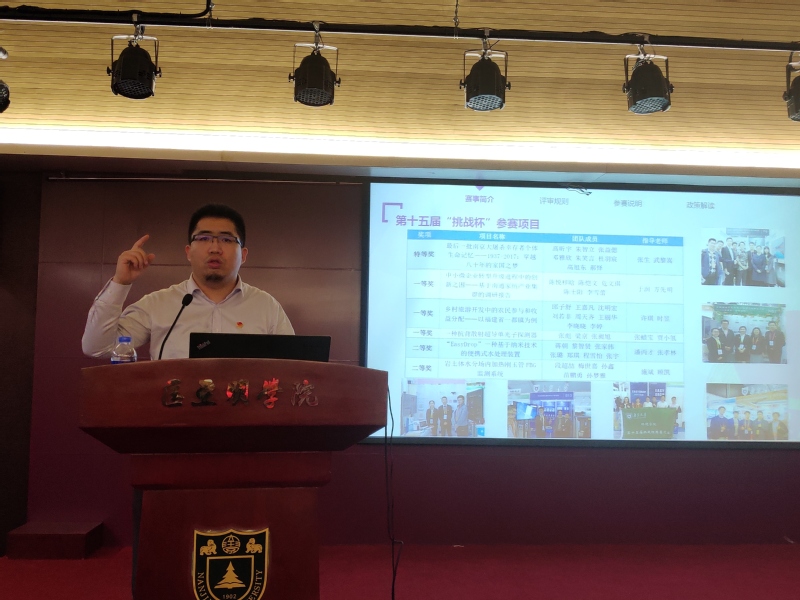 “挑战杯”是由共青团中央、中国科协、教育部等主办的面向全国所有大学生的科技创新类最高水平竞赛,至今已有20年历史。每年参与高校超过1000所,参赛学生超过200万人,被誉为当代大学生科技创新的“奥林匹克”盛会,它也被称为试金石——衡量一所大学人才培养成效的重要指标。曲老师就竞赛流程和南京大学近三年参加“挑战杯”在全国的获奖成绩做了逐一介绍,让同学们对参加这项赛事产生了极大的向往。为帮助同学们准备和参加“挑战杯”,曲老师举例介绍了第十五届“挑战杯”南京大学的参赛项目,并针对匡院同学理科专业的背景和大理科培养模式的优势,给同学们提出了很多可行的建议和指导。