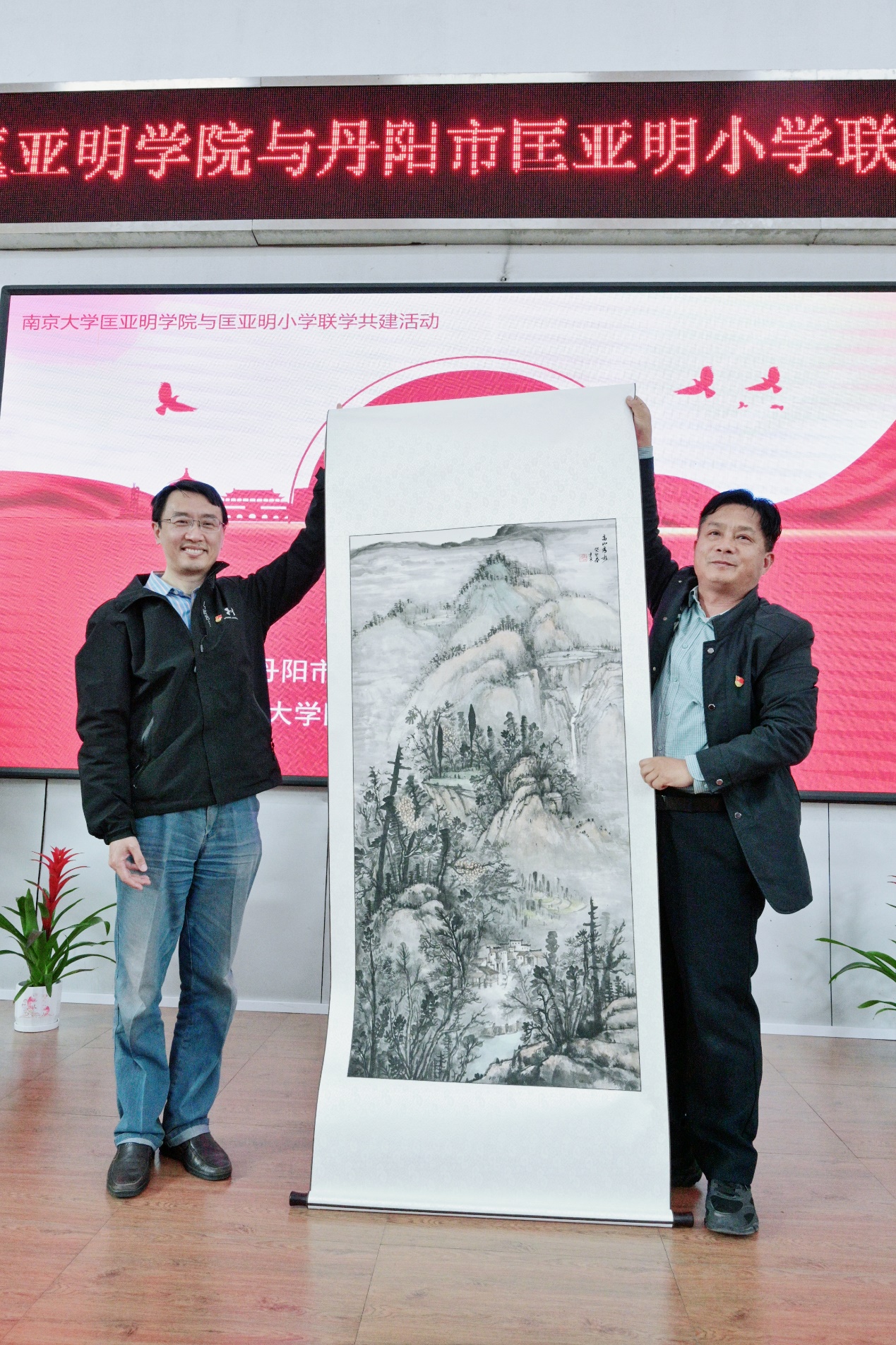 拉斯维加斯娱乐城平台 小学党支部书记蔡建良先生向拉斯维加斯娱乐城平台 党委书记、院长王骏回赠画作,以一副亲笔所绘的山水画,祝愿两校情谊“山高水长”。