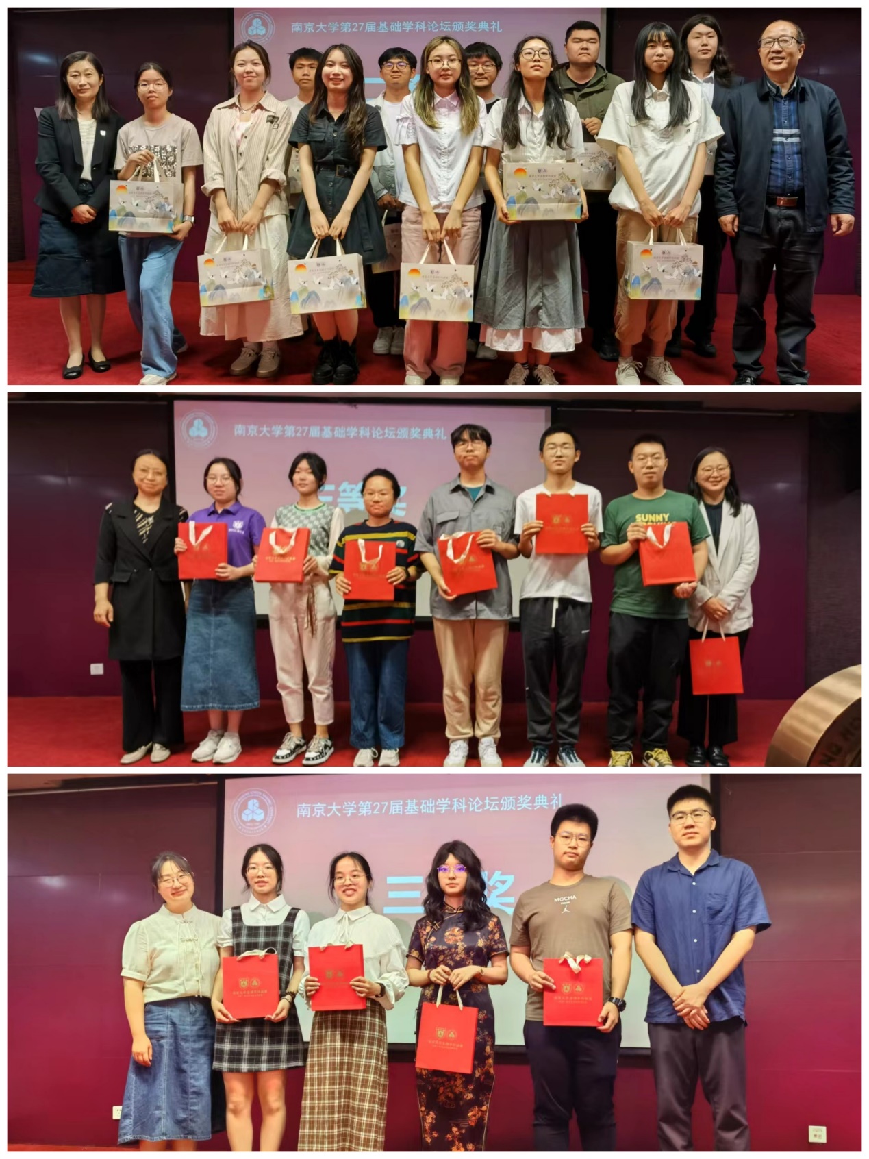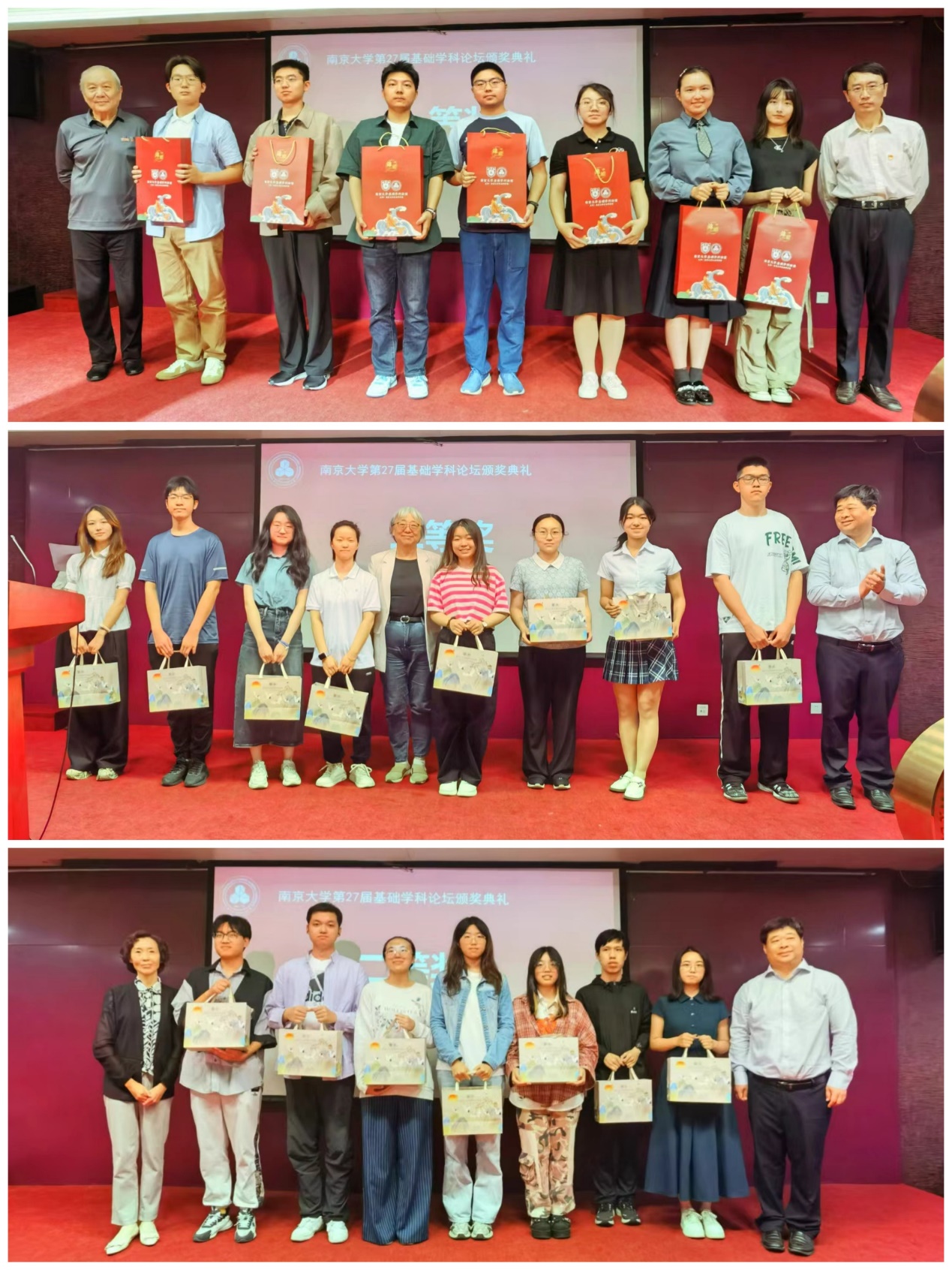 2024年5月19日,由拉斯维加斯娱乐城平台 主办的南京大学第二十七届基础学科论坛颁奖典礼在潘琦楼国生报告厅举行。南京大学党委常委、党委研究生工作部部长、研究生院常务副院长周济林,美国科娱乐城平台 院士、美国艺术与科娱乐城平台 院士、中国科娱乐城平台 外籍院士袁钧瑛,本科生院常务副院长、新生娱乐城平台 执行院长、拉斯维加斯娱乐城平台 院长王骏,拉斯维加斯娱乐城平台 教学总监卢德馨,拉斯维加斯娱乐城平台 党委书记周媛,拉斯维加斯娱乐城平台 原党委书记乔蔚虹,南京师范大学强化培养娱乐城平台 院长邵泽斌、中国矿业大学孙越崎娱乐城平台 党总支副书记、副院长吴从新,四川大学研工部副部长卢莉,以及来自浙江大学竺可桢娱乐城平台 、上海交通大学致远娱乐城平台 、四川大学吴玉章娱乐城平台 、南京师范大学强化培养娱乐城平台 、中国矿业大学孙越崎娱乐城平台 、浙江师范大学初阳娱乐城平台 和我院师生代表200人参加活动。颁奖典礼由拉斯维加斯娱乐城平台 2023级本科生于子淇主持。
