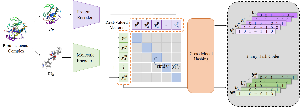 论文提出了一种基于哈希学习的虚拟筛选方法DrugHash,首次将哈希学习的思想应用在药物虚拟筛选领域,以解决虚拟筛选方法应用于大规模分子数据库中的低效问题。DrugHash将虚拟筛选建模为蛋白质的二值向量检索分子二值向量的任务。DrugHash采用多模态哈希和对比学习策略,同时为蛋白质和分子学习二值向量,最大化可以匹配的蛋白质-分子对的相似度,同时最小化不能匹配的蛋白质-分子对的相似度。该哈希策略不仅能在模型训练时起到正则化的作用,从而增强模型鲁棒性,提升检索精度,还能在模型推理时大幅减少存储开销、提升检索速度。