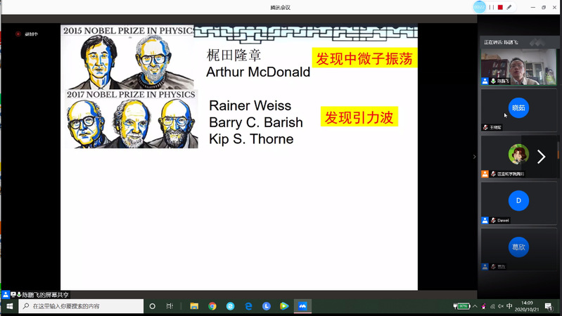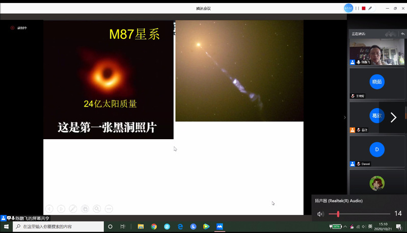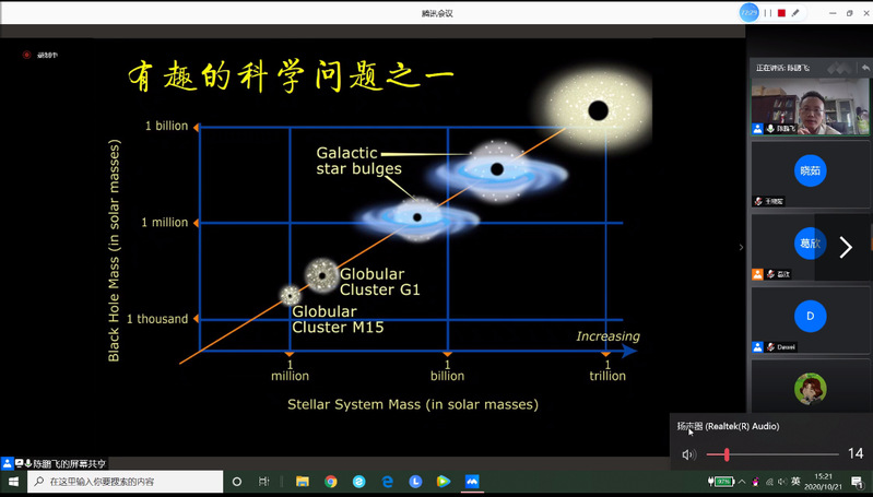 2020年10月21日,娱乐城平台-拉斯维加斯娱乐城平台 又举办了线上名师导学讲座,陈老师首先从诺贝尔物理学奖讲起,对比这些年诺贝尔物理学奖的获奖领域就会发现近几年天体物理的发展趋势。然后陈老师就进入今天的主题“黑洞”,陈老师说他其实是“门外汉”,今天的讲座其实是一个故事性质。在今天的课程中,我们了解到很多很多的天体,比如太阳、白矮星等等。我们也看到了M87中心的黑洞照片,这也是洗了两年之久的第一张黑洞照片。陈老师也给我们介绍了三个有趣的科学问题——黑洞的质量与黑洞所在星系质量成线性关系、能量、引力波。陈老师用这三个科学问题结束了今天的讲座。
