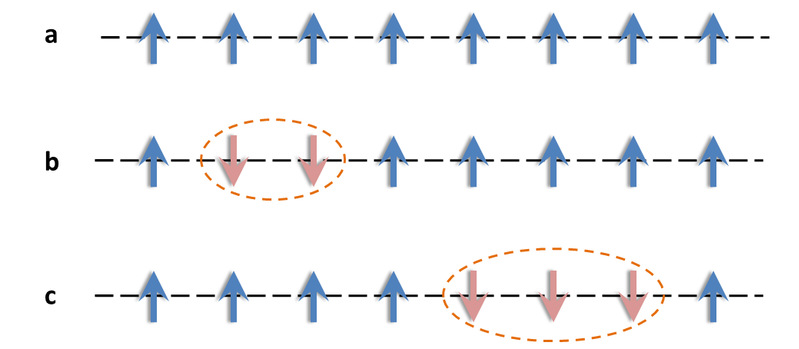 图a是SrCo2V2O8自旋链的一个基态,图b和c分别表示长度为2和3的弦态,即2-string和3-string