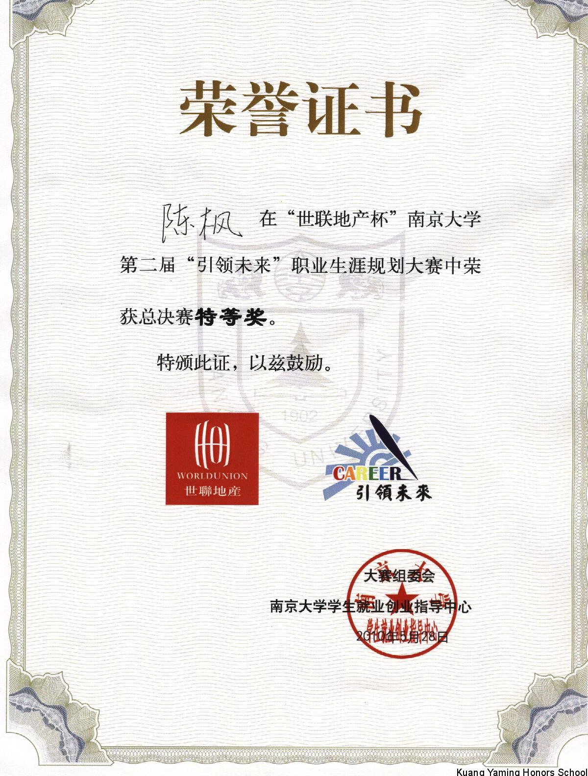 2006级理科班陈枫获第二届南京大学“职业生涯规划大赛”特等奖