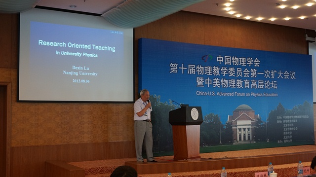 2012年8月5-8日,由中国物理学会举办的“中国物理学会第十届物理教学委员会第一次扩大会议暨中美大学物理教育高层论坛”在京召开。会议期间,美国物理教师协会(AAPT)主席D.Sokoloff,哈佛大学物理教授、著名物理学家、物理教育研究专家E.Mazur, 国际物理教育委员会(IUPAP-ICPE)前秘书长D. Zollman,AAPT国际合作委员会主席L.Bao,先后就美国物理教育与物理教育研究的各个侧面分别作了报告。作为交流,我国物理教学委员会邀请北京大学赵凯华等五位教授也分别作了报告。其中,南京大学卢德馨教授就物理课程研究型教学作了主题报告,并向四位来宾赠送了他所著的《University Physics》一书。杨振宁先生也出席大会并就中美大学物理教育比较问题发表演讲。