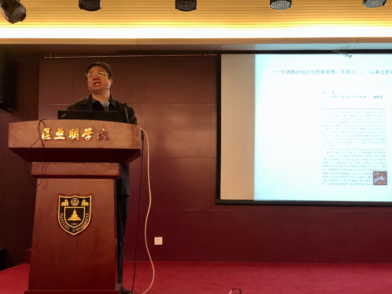 11月13日,南京大学文娱乐城平台 教授苗怀明老师为拉斯维加斯娱乐城平台 及拔尖班的同学们进行了一场题为“一位清醒而痛苦的悲剧英雄——《三国演义》诸葛亮形象解读”的讲座。苗怀明老师现为南京大学文娱乐城平台 副院长、教授、博士生导师、古代小说网创办人及主持人。教授语言平实幽默,用最生动的语言为同学们还原了一个个历史事件,加深了同学们对《三国演义的理解》,整场讲座气氛轻松活跃。