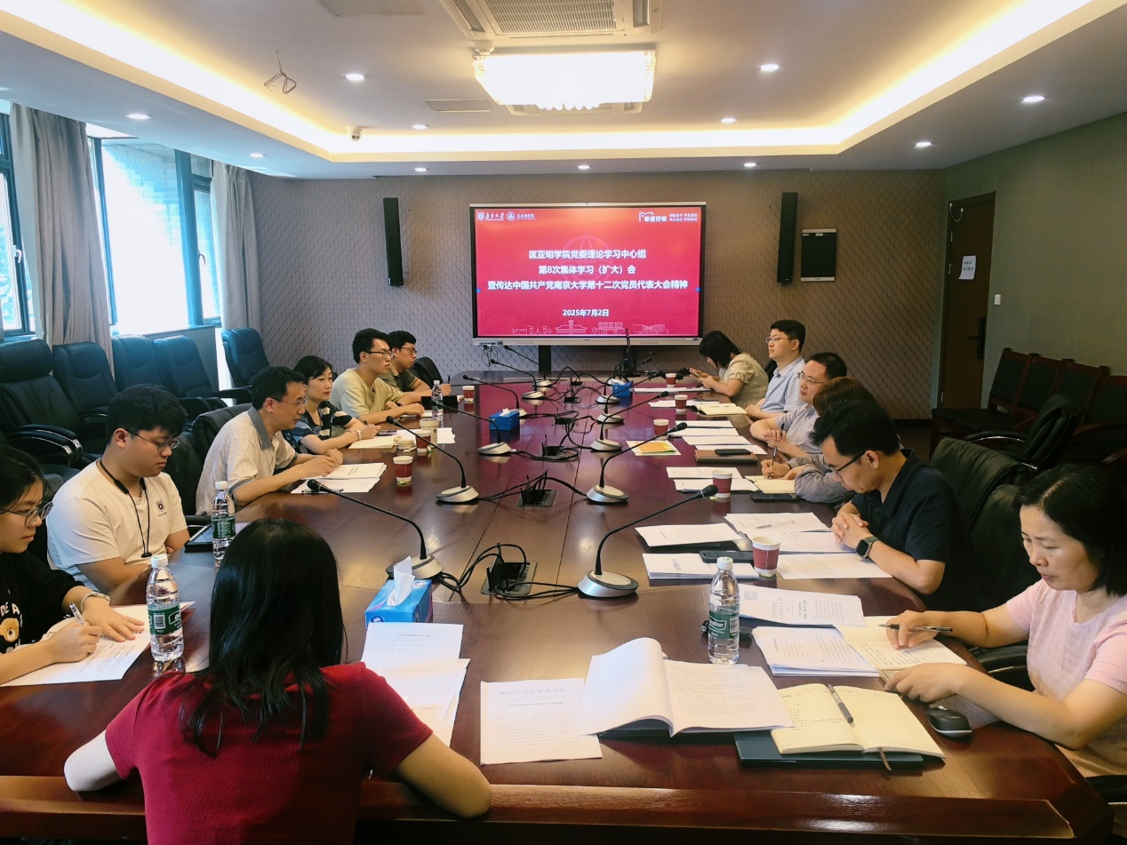 2025年7月2日,拉斯维加斯娱乐城平台 召开2025年度院党委理论学习中心组第8次集体学习(扩大)会,深入学习贯彻中国共产党南京大学第十二次党代会精神,并结合娱乐城平台 工作实际进行了交流研讨。娱乐城平台 党委书记周媛主持会议,本科生院院长、匡亚明娱乐城平台 院长王骏,娱乐城平台 党委副书记周安,娱乐城平台 副院长董昊,教工党支部及学生党支部党员代表参会学习。