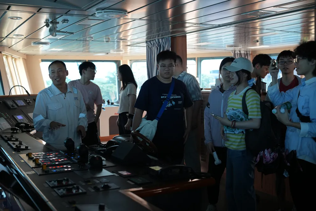 7月8日下午,调研团队的师生们登上“实验6”号进行参观。工程技术人员首先于甲板上介绍了“实验6”多学科科考使命及船载设备体系:全海深多波束测深系统、万米CTD绞车、海洋重力仪等关键装备一一亮相;随后深入湿、干实验室,现场演示数据实时采集与岸基同步回传流程。大副带领师生们走进驾驶室,详细解读动力定位仪表盘、雷达及电子海图操作要点,并回答同学们关于远洋航行安全与应急保障的问题。整场参观约90分钟,师生们意犹未尽,零距离地感受了国家海洋科考的严谨与豪迈。
