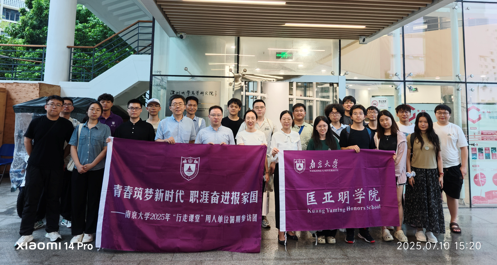 7月10日下午,调研团队转赴深圳大学高等研究院。座谈会上,深大对南大匡院等师生的到访表示热烈欢迎,两校学生代表依次介绍各自培养方案与学习体会:深大同学聚焦交叉创新平台与产业协同育人,匡院同学则阐述“大理科”贯通式、个性化培养路径。双方围绕课程设置、科研训练、国际交流等议题坦诚交流,会场气氛活跃。随后,师生共同参观深大校史馆,从“特区大学、窗口大学、实验大学”的办学定位,到校地共建、资金政策持续投入所催生的高速成长,深刻感受深圳高等教育与城市发展同频共振的澎湃动力。