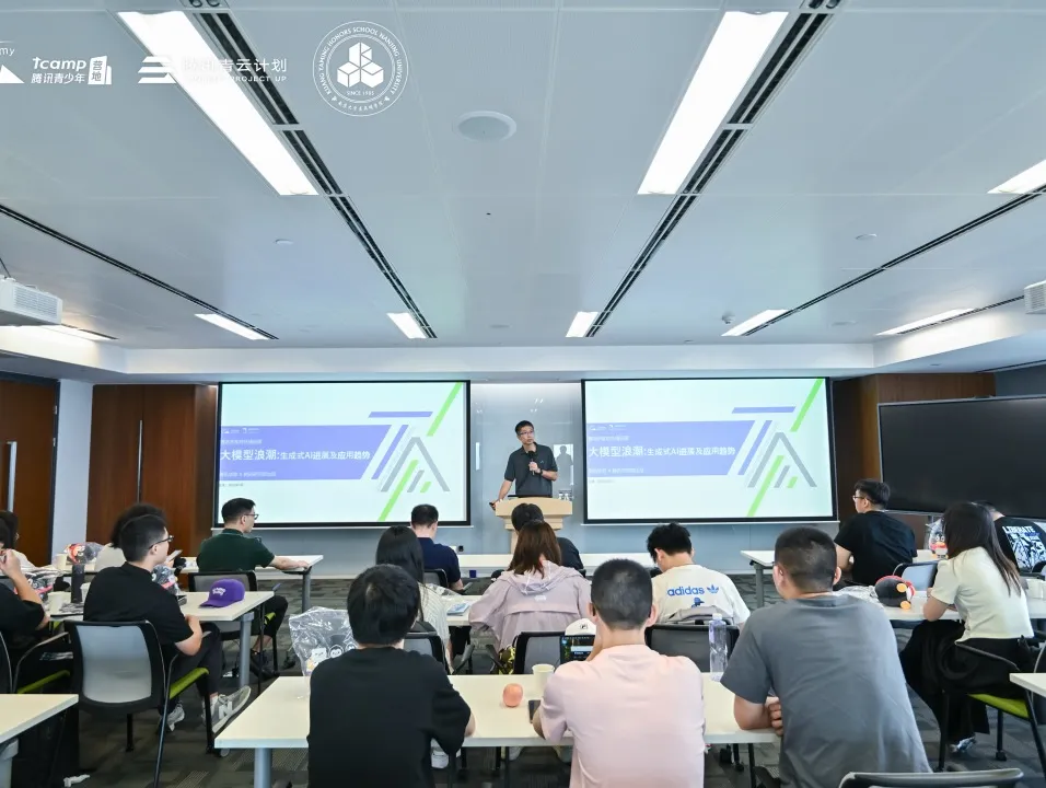 随后的课堂学习部分内容丰富。资深讲师张厚望带来了《腾讯的8个产品理念》课程,核心强调“一切以用户为本”,并深入讲解了“内部三角”(定位、需求、匠心)和“外延四要素”(时机、危机、商业、合作)。混元3D创作引擎技术负责人刘思聪则分享了突破性的《混元3D生成大模型》,展示了仅需文本或图片描述即可一键生成可交互3D场景的能力,预示着3D创作的大众化趋势。郑宇老师在《大模型浪潮》课程中解读了腾讯的AI战略布局,包括对算力基建、高质量数据和顶尖人才的投入,并通过AI生成音色等应用让同学们感受到生成式AI的巨大潜力。
