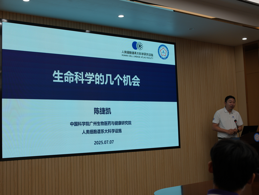 7 月 7 日下午,在结束科学城园区的参观后,团队师生们又在广州健康院的安排下前往广州生物岛,走进全球首个、也是目前唯一聚焦“人类细胞谱系”的大科学装置——人类细胞谱系大科学研究设施。该设施通过高通量单细胞测序、活体成像和人工智能算法,把从受精卵到成体的每一次细胞分裂、分化、迁移乃至病变过程进行实时追踪,最终绘制成亚细胞分辨率的3D“生命地图”。它不仅为癌症早筛、器官再生和抗衰老研究提供精准“导航图”,也让师生们第一次直观感受到“生命的源代码”如何被读取、解码和改写。参观期间,师生重点了解了设施的高通量单细胞测序平台、活体显微成像系统及配套数据算法,并就技术细节与科研人员进行了简短交流。