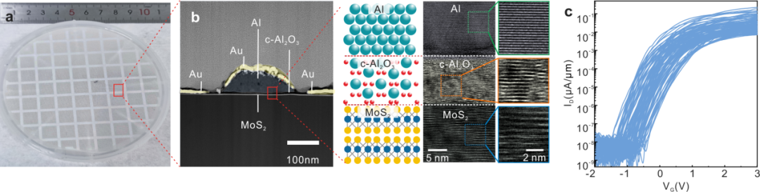 图2. 基于c-Al2O3 栅介质的二维MoS2晶体管。a, 4英寸二维c-Al2O3/MoS2晶体管阵列;b, c-Al2O3/MoS2晶体管器件截面TEM图;c,c-Al2O3/MoS2晶体管器件转移特性曲线。
