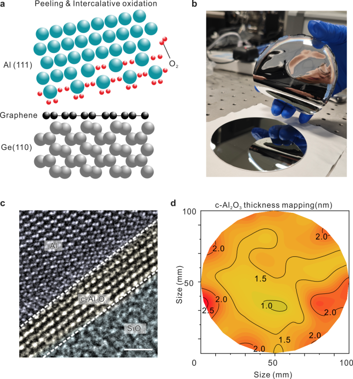 图1.蓝宝石单晶(c-Al2O3)栅介质薄膜。a,单晶Al(111)插层氧化形成c-Al2O3示意图。极低氧含量条件下,氧原子逐层进入Al(111)晶格中;b, 4寸单晶Al(111)晶圆。c,单晶Al(111)/c-Al2O3在SiO2衬底上的截面HRTEM图像。标尺:1nm;d,c-Al2O3晶圆厚度分布图。