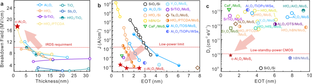 图3. 基于c-Al2O3 栅介质的二维MoS2晶体管性能。a,击穿场强;b,泄漏电流;c,界面态密度。