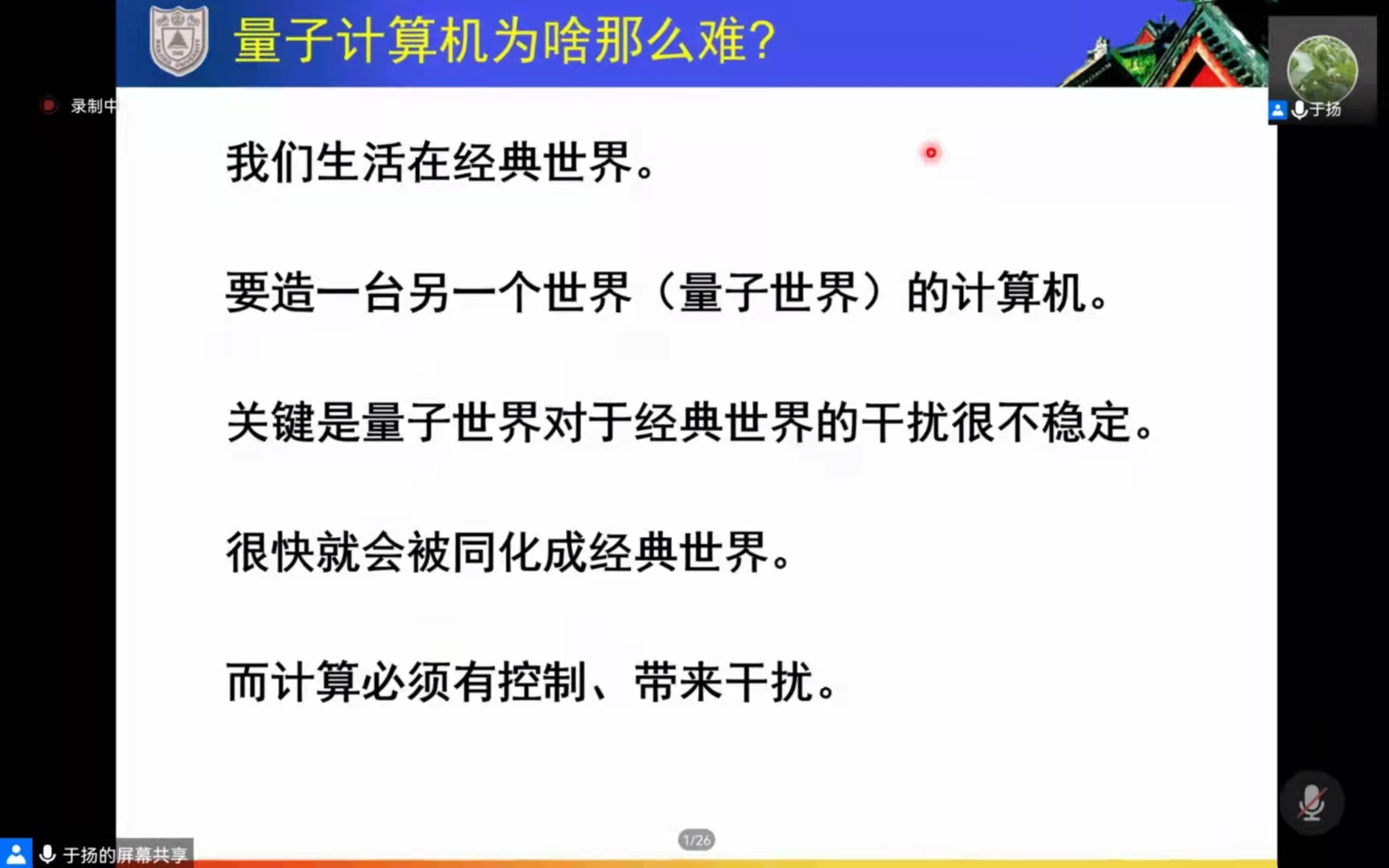 于教授提出量子信息处理这一重大课题,为我们讲解量子通信、量子精密测量、专用量子计算机与通用量子计算机四大应用领域内目前的科研成果与仍面临的应用、技术问题。