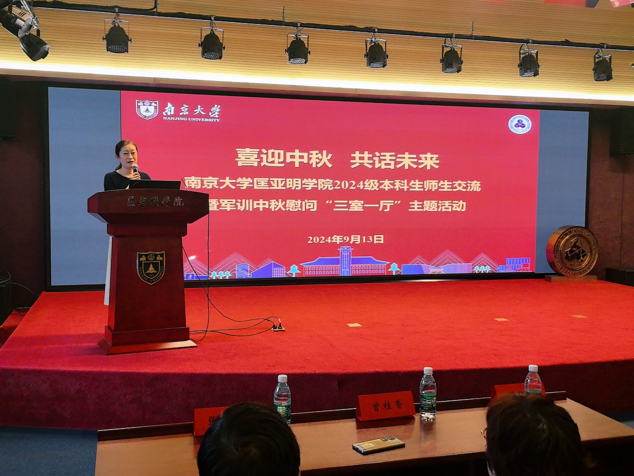 2024年9月13日,“喜迎中秋 共话未来”娱乐城平台-拉斯维加斯娱乐城平台 2024级本科生师生交流暨军训中秋慰问“三室一厅”主题活动在潘琦楼国生报告厅圆满举行。拉斯维加斯娱乐城平台 党委书记周媛、党委副书记周安、副院长董昊、班主任郭亚冲、老师代表以及2024级全体本科生130余人共同参加活动。活动由周安主持。