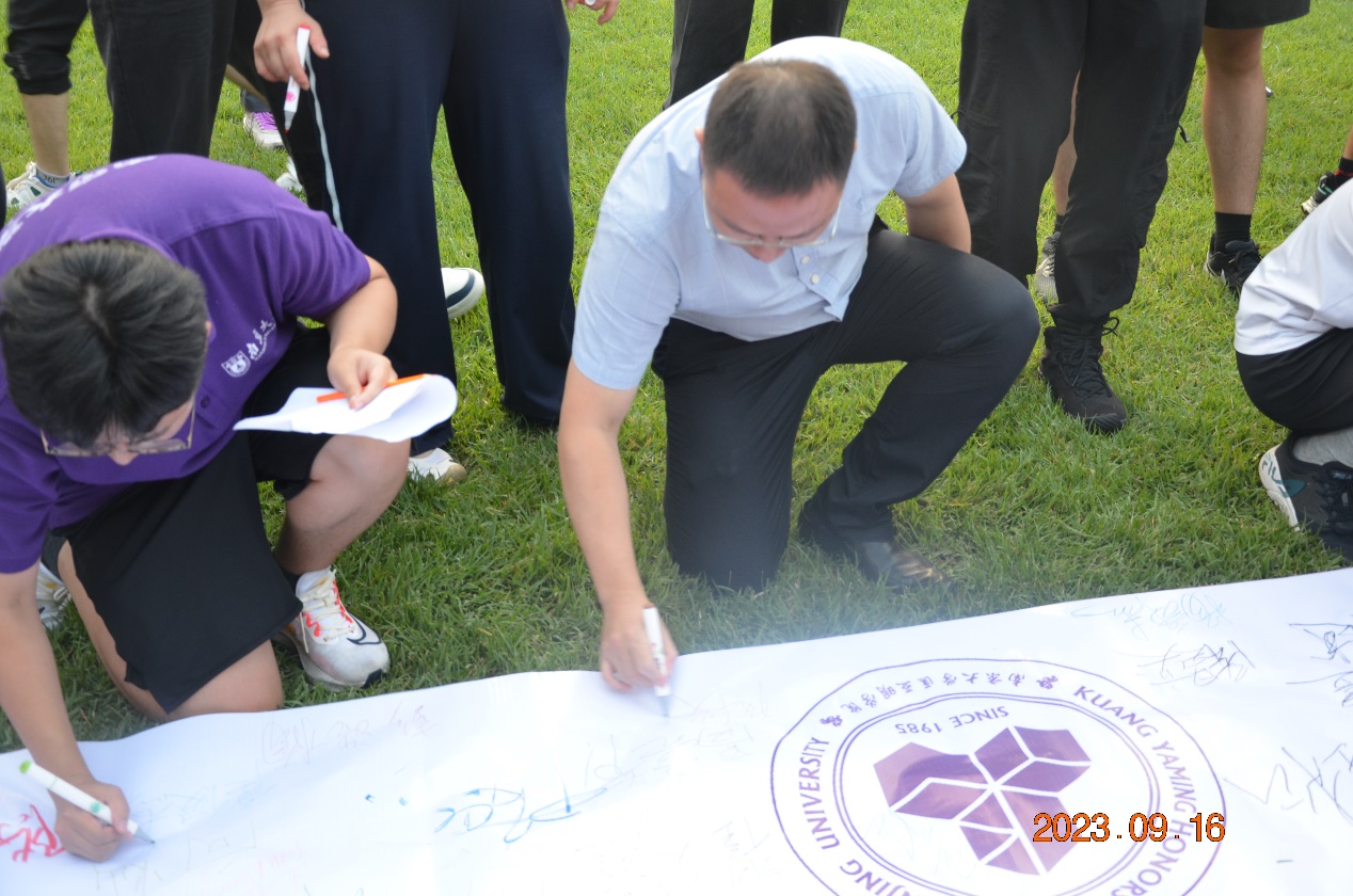 所有老师和同学在印有拉斯维加斯娱乐城平台 院徽的长幅上签下自己的名字,这张由所有23级匡院成员名字组成的全家福也就此张贴在院楼中,标志着新一届匡院学子的扬帆远航