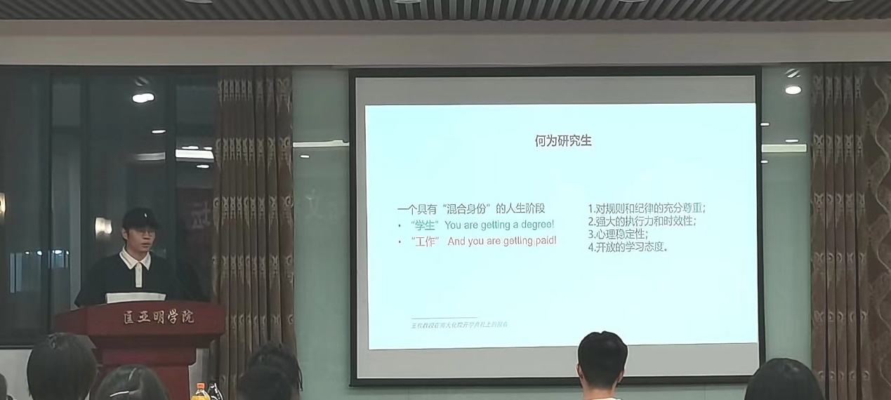 杨玉钦同学向2022级的各位研究生新同学表示热烈祝贺和欢迎。杨学长提到,研究生是一个具有“混合身份”的人生阶段,不仅需要面对学生的学习任务,同时还需要面对繁重的科研任务。因此他提供了一些建议,即对规则和纪律的充分尊重、具有坚强的执行力和时效性、心理的稳定性以及开放的学习态度。导师往往同时承担教学、科研、行政以及社会服务等义务,十分忙碌。对研究生来说,导师是最重要的学术资源,高效的沟通可以更加有效利用导师的时间和智慧。因此在与导师的沟通方面,学长给予了很多策略,比如在每次与导师沟通时需要先将自己课题的背景以及之前的进展简单总结给导师,以此达到高效沟通的目的。同时,学长还特别提醒,研究生阶段可能会面临压力大、焦虑等心理问题,大家可以利用组内、院内、校内等各种资源及时排解,确保心理健康的完成学业。